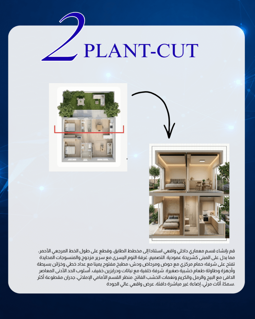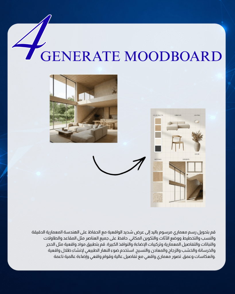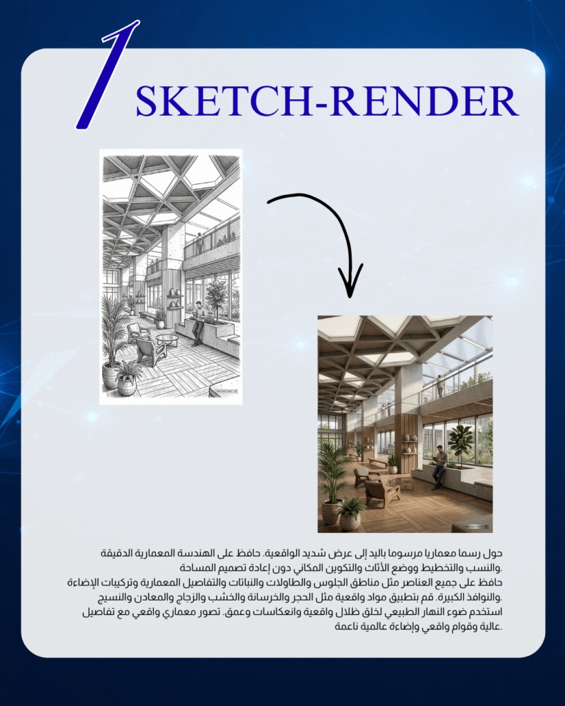 حول رسما معماريا مرسوما باليد إلى عرض شديد الواقعية. حافظ على الهندسة المعمارية الدقيقة والنسب والتخطيط ووضع الأثاث والتكوين المكاني دون إعادة تصميم المساحة.