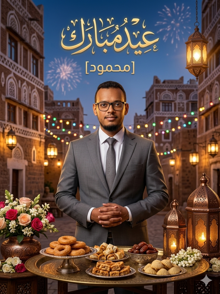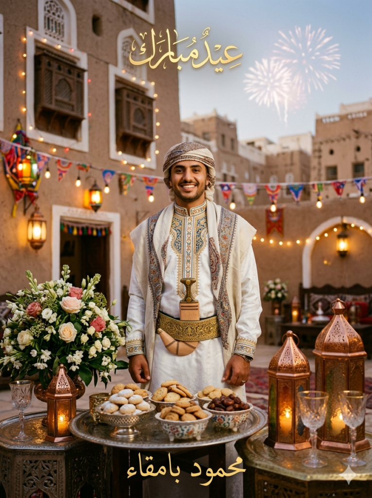 بيئة احتفالية غنية مستوحاة من أجواء عيد الفطر في [دولتك]، مع تفاصيل معمارية محلية أصيلة تعكس طابع [حضرموت]، فوانيس مضيئة، زينة العيد، ولمسات ألعاب نارية ناعمة في الخلفية.